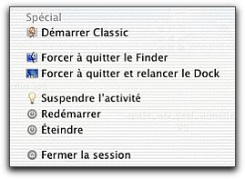 La petite lampe jaune déroule un menu que MacOS 9 aurait appelé "Spécial". En effet, il nous permet, très facilement, d'ordonner des actions propres au système, que vous pouvez voir dans la figure suivante: