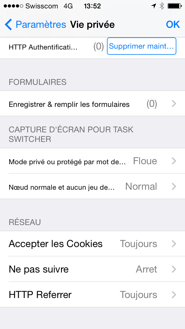 La navigation privée également est réussie: vous pouvez paramétrer l'application pour que si vous la quittez (sans même la tuer) et que vous revenez après dessus, ce qui était à l'écran disparaisse et ne soit plus accessible.