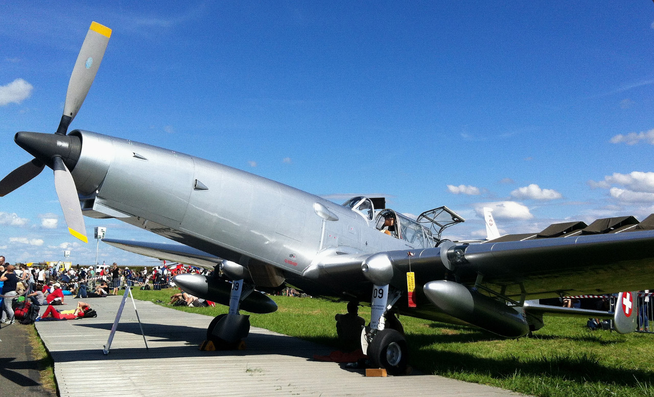 Un Pilatus P2, avec moteur Argus AS-410 V12 en ligne de 465CV, hélice à pas variables et train rentrant; une des premières machines tout aluminium conçue en Suisse.